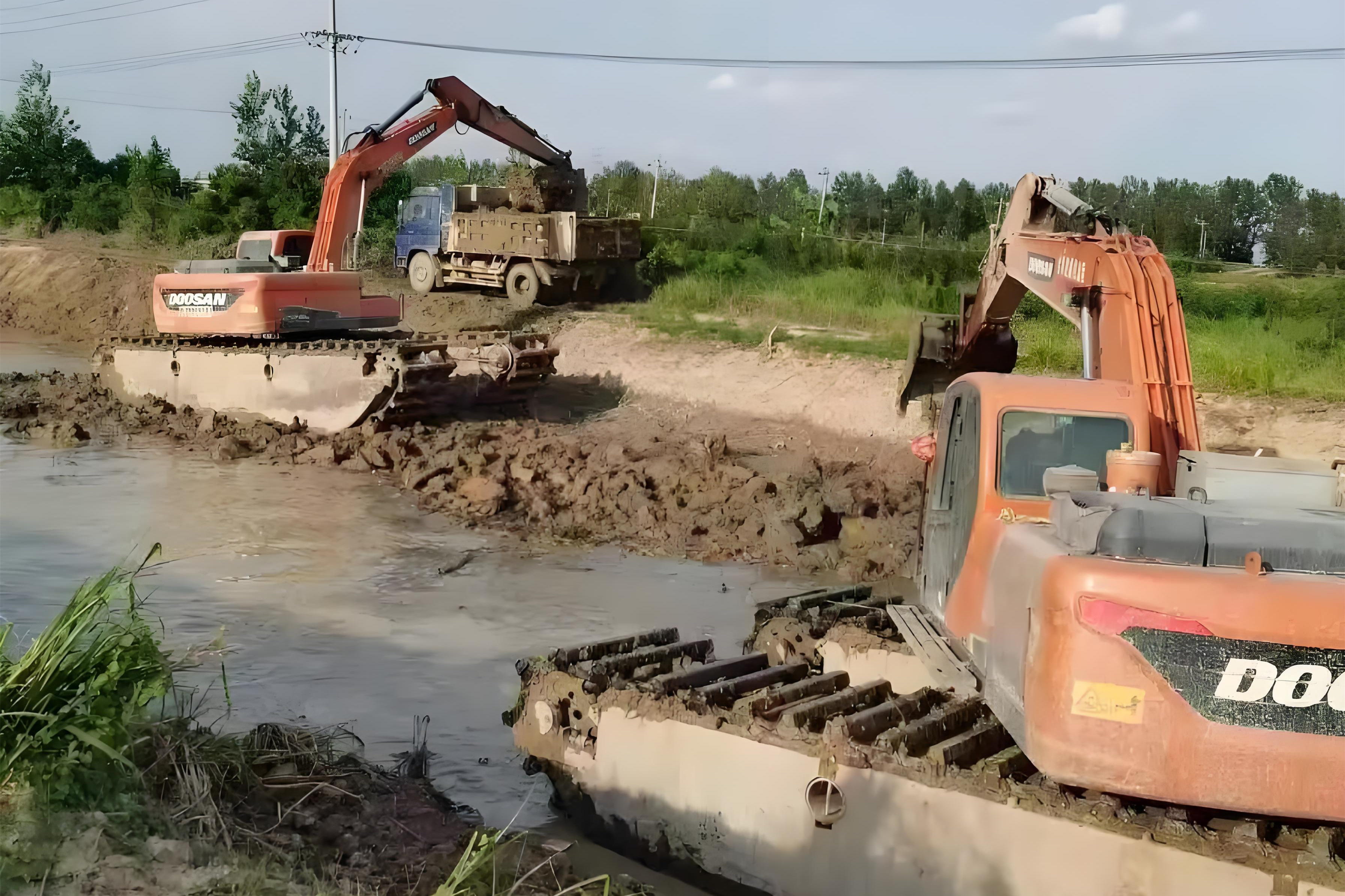 另一類是兩棲挖機,它既能在陸地跑,也能在水里作業(yè),履帶更寬,接地壓力小,在水深不超過 1.5 米的區(qū)域特別好用。